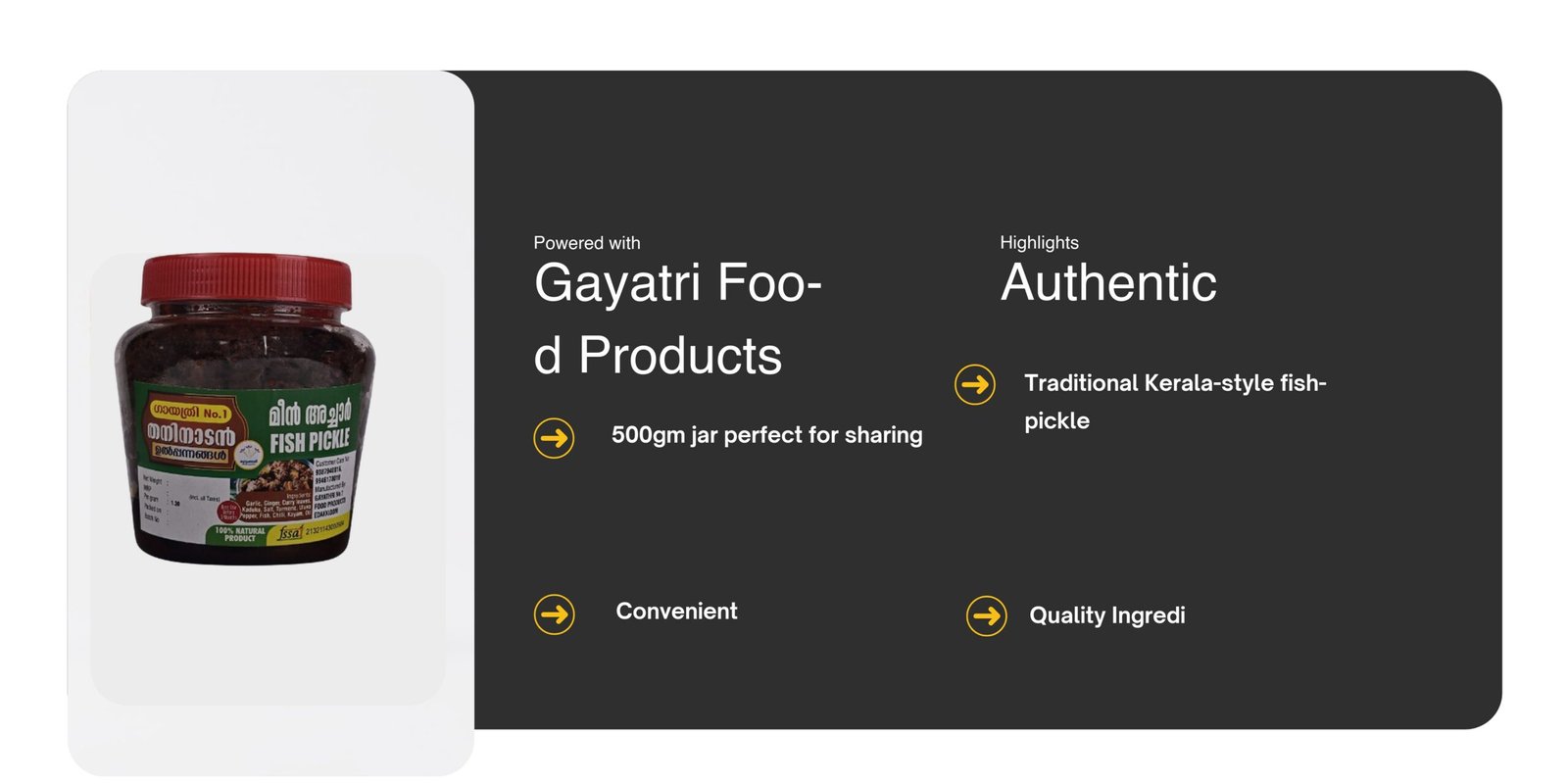 Perfect for everyday use or special occasions, indulge in the delightful experience that is Gayatri Food Products Fish Pickle, and bring a taste of Kerala to your table.