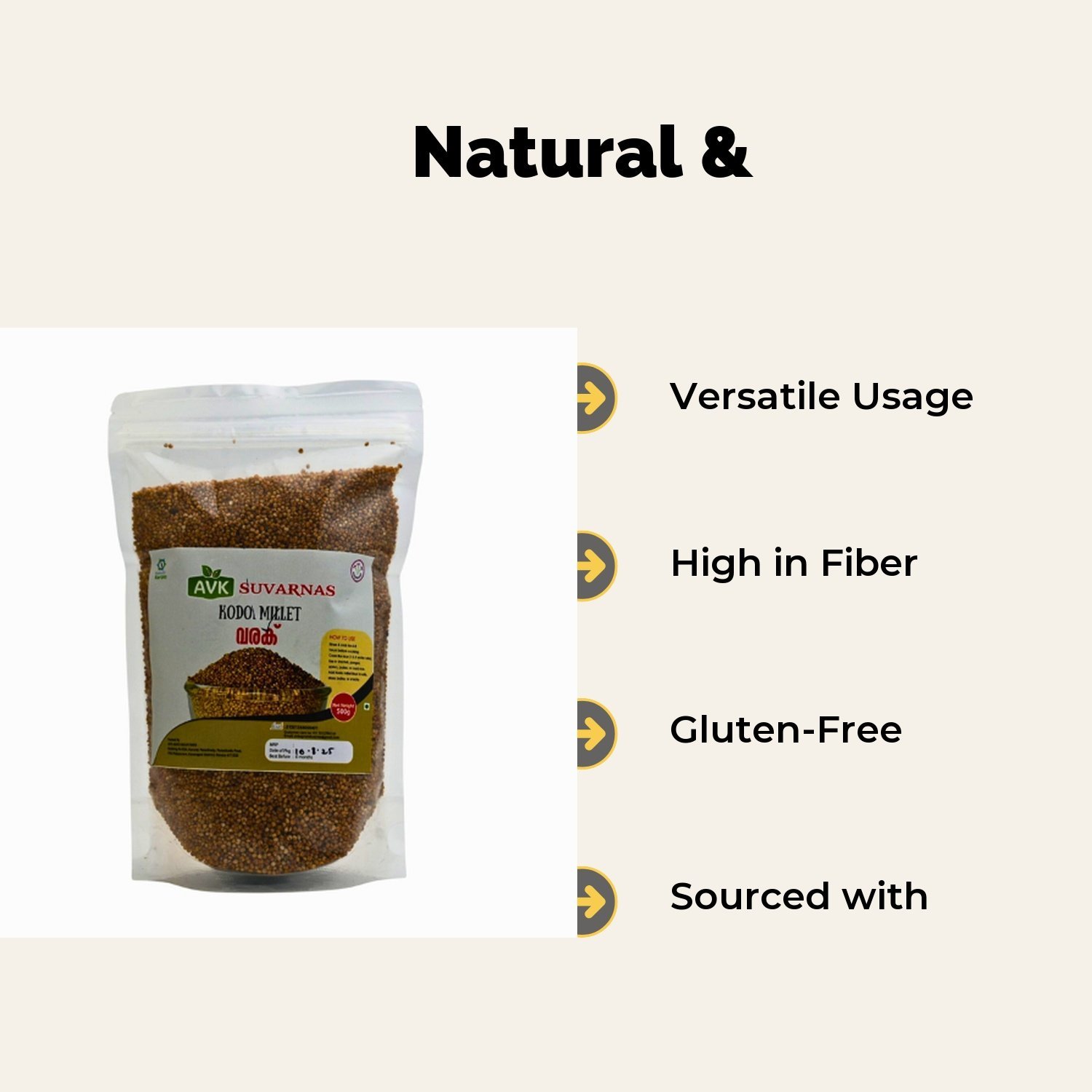 Discover the wholesome goodness of AVK Suvarnas Kodo Millet, a carefully cleaned and hand-processed grain that is rich in fiber, protein, and essential minerals. This 100% natural and preservative-free millet serves as a versatile ingredient, perfect for preparing healthy dishes like upma, pongal, dosa, or flavorful pulao, making it an excellent choice for health enthusiasts and anyone looking to incorporate nutritious elements into their diet.