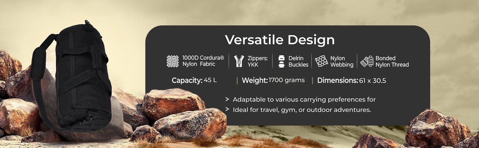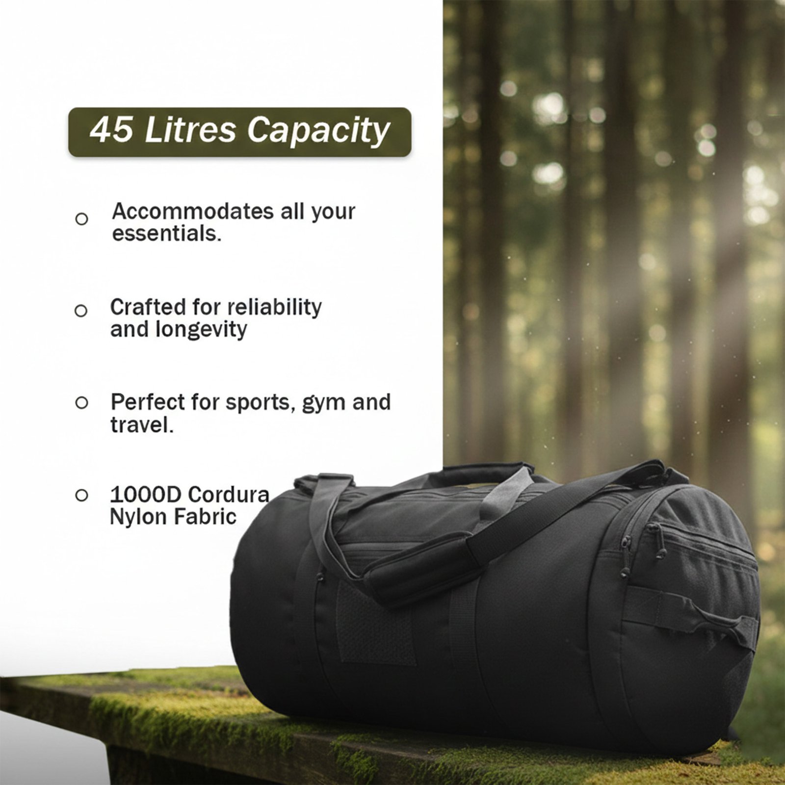 Introducing the Large Travel Duffle Bag in Black, your ultimate companion for all your travel adventures. This duffle bag is crafted from heavy-duty 1000D Cordura nylon fabric, ensuring unparalleled durability and resistance against wear and tear. Ideal for both frequent travelers and casual weekend getaways, its spacious 45L capacity accommodates all your essentials with ease.