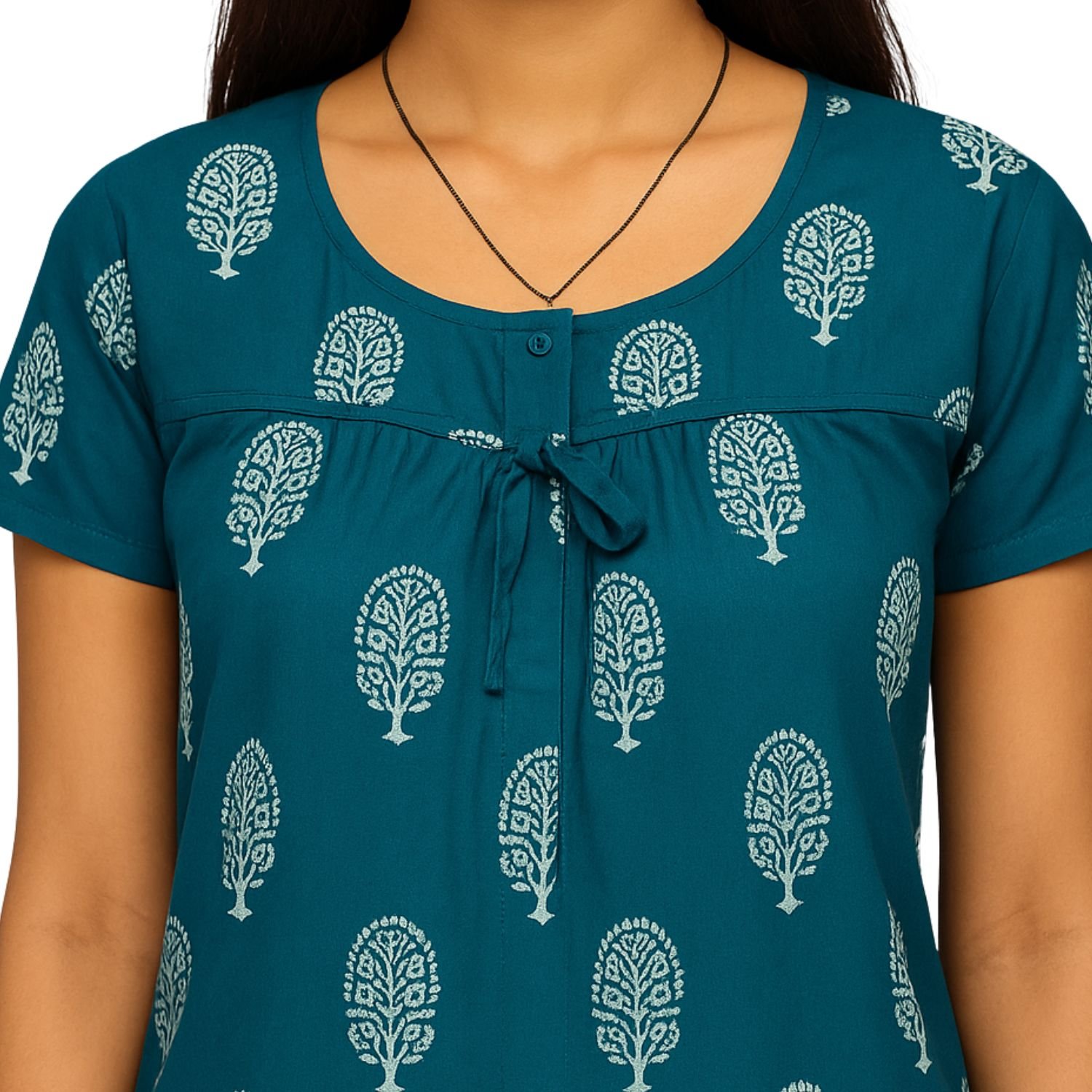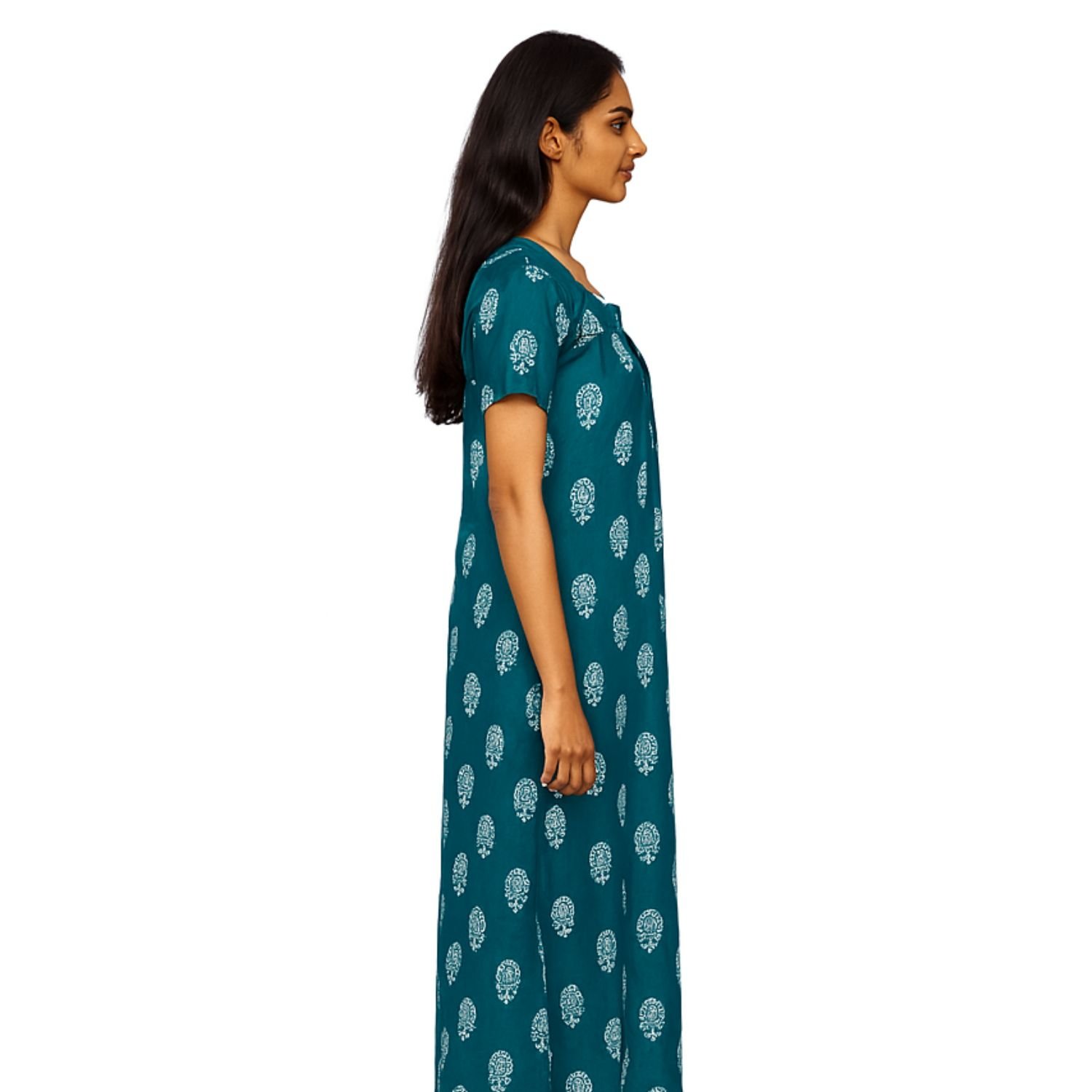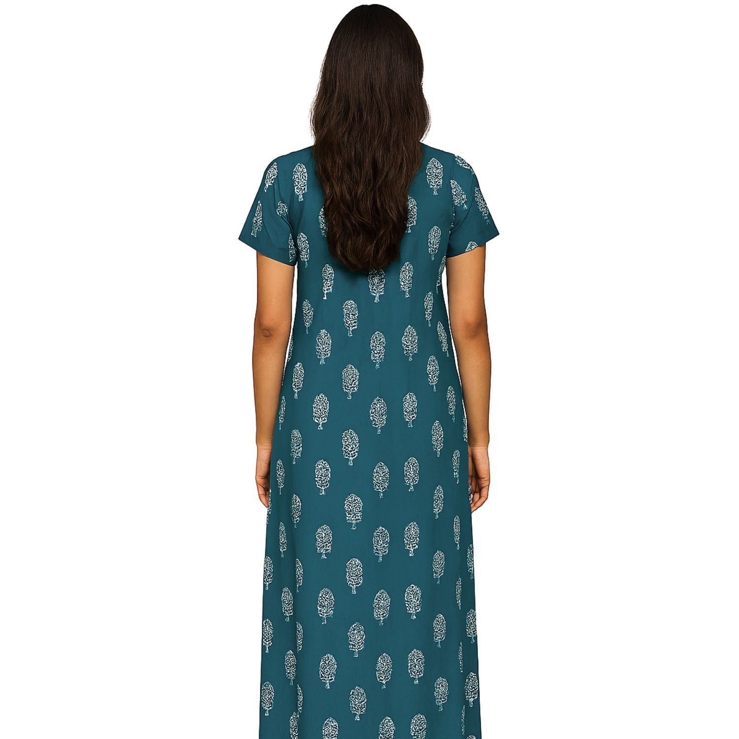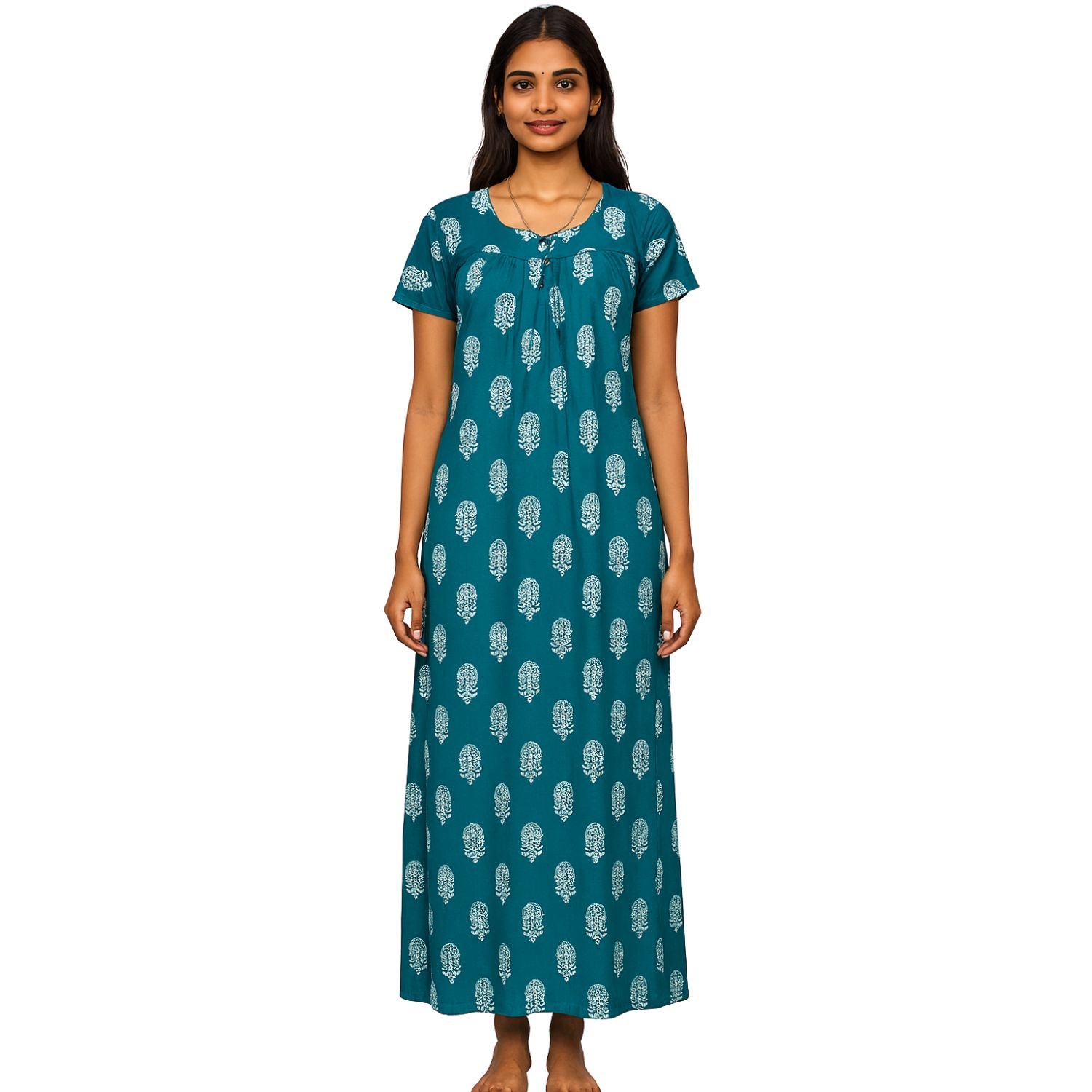 This nighty is made from soft, breathable fabric, perfect for a peaceful night’s sleep. The base color is a calming blue, with white prints scattered throughout the fabric. The prints could range from simple geometric shapes, floral motifs, or abstract patterns, giving it a fresh, modern look. The color contrast between the blue and white creates a serene, tranquil appearance.
