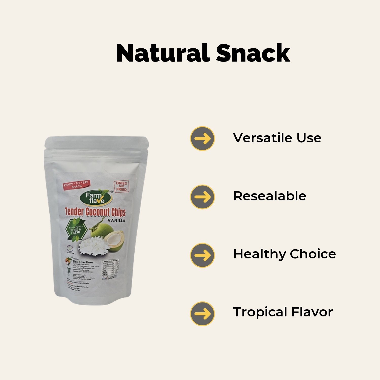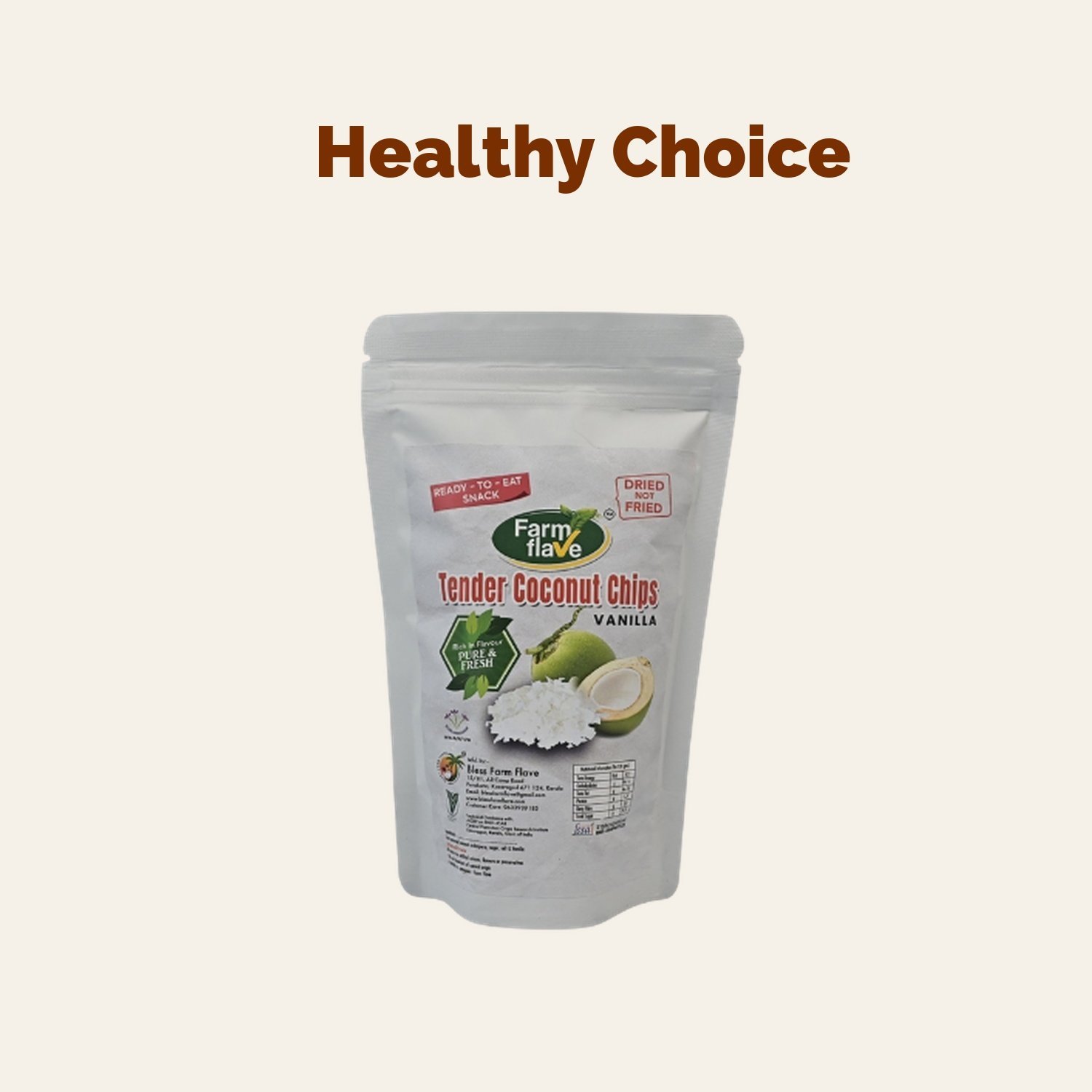 Indulge in the tropical delight of our Tender Coconut Chips infused with smooth vanilla. Each bite delivers a satisfying crunch, making it the perfect snack for health-conscious consumers. Made from all-natural tender coconuts, these chips are a guilt-free option for your snacking needs, satisfying your cravings without compromising your diet. The tropical taste and aroma of vanilla transform every chip into a little moment of paradise. Perfect for on-the-go snacking or as a topping for yogurt and desserts, they come packed in a resealable 100g bag, ensuring freshness with every use. Enjoy the freshness and health benefits of coconut, crafted with care to bring you the best nature has to offer. Ideal for fitness enthusiasts, families, or anyone looking for a delicious yet nutritious snack, these tender coconut chips are a must-try treat that combines indulgence and wellness seamlessly. Treat yourself or share with loved ones; either way, you’ll enjoy a delightful snack that satisfies and nourishes.