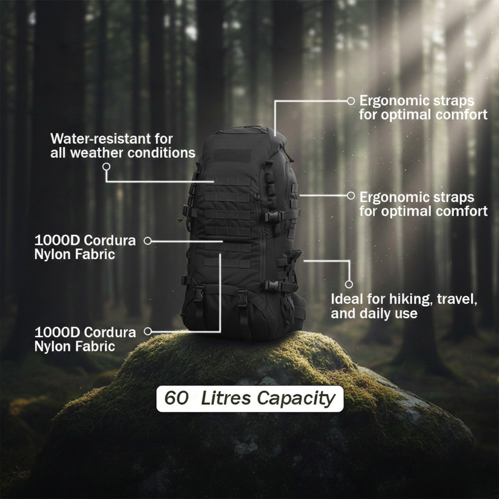 Introducing the Trekking Bag, a versatile 45-liter backpack designed for avid adventurers and outdoor enthusiasts. Crafted from premium 1000D Cordura nylon, this black trekking bag combines durability with a sleek design, making it perfect for hiking trips, travel, and everyday use. The high-quality YKK zippers ensure smooth operation, while the Delrin buckles and bonded nylon thread reinforce its robust construction, allowing you to carry your essentials with confidence.