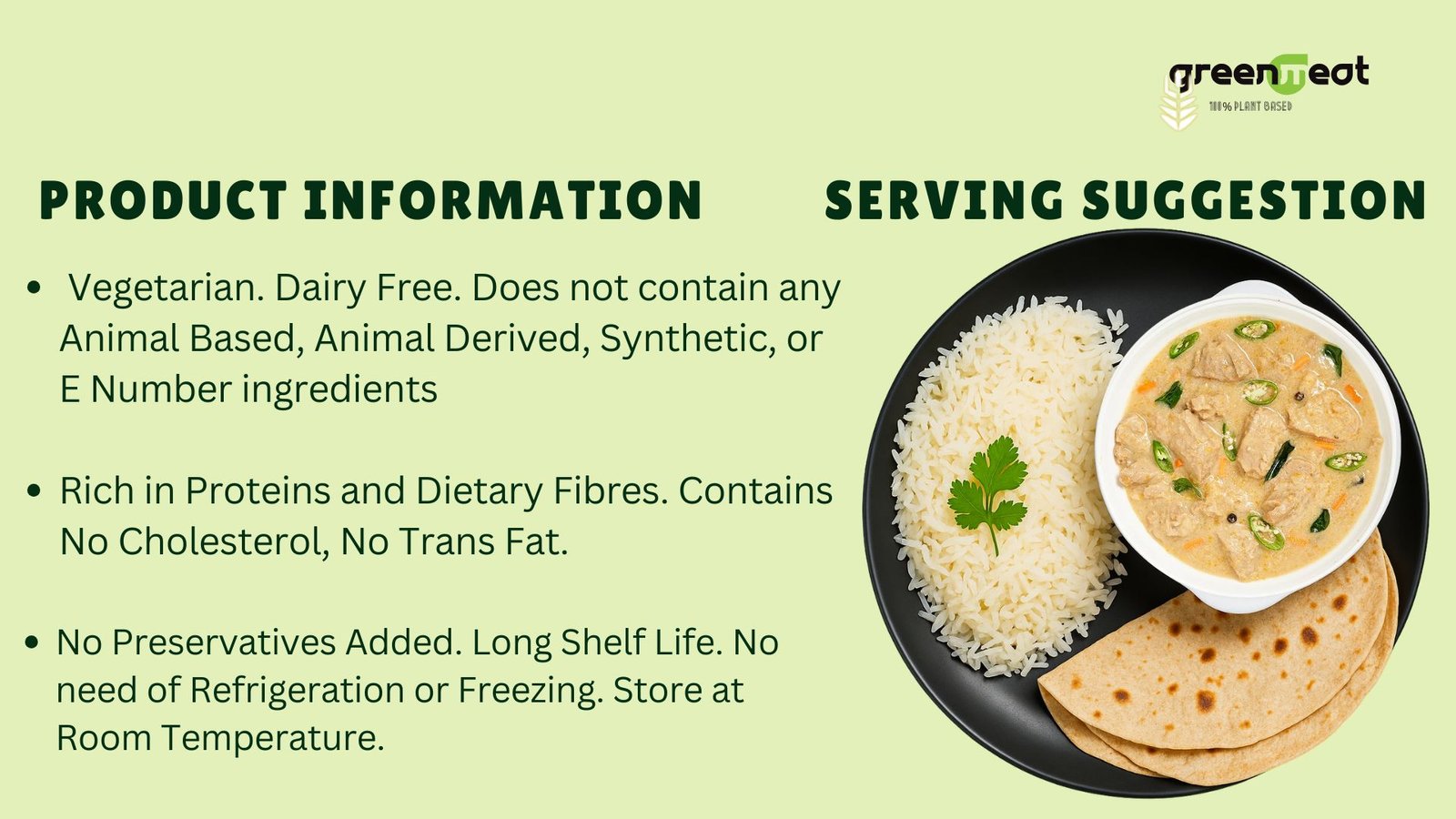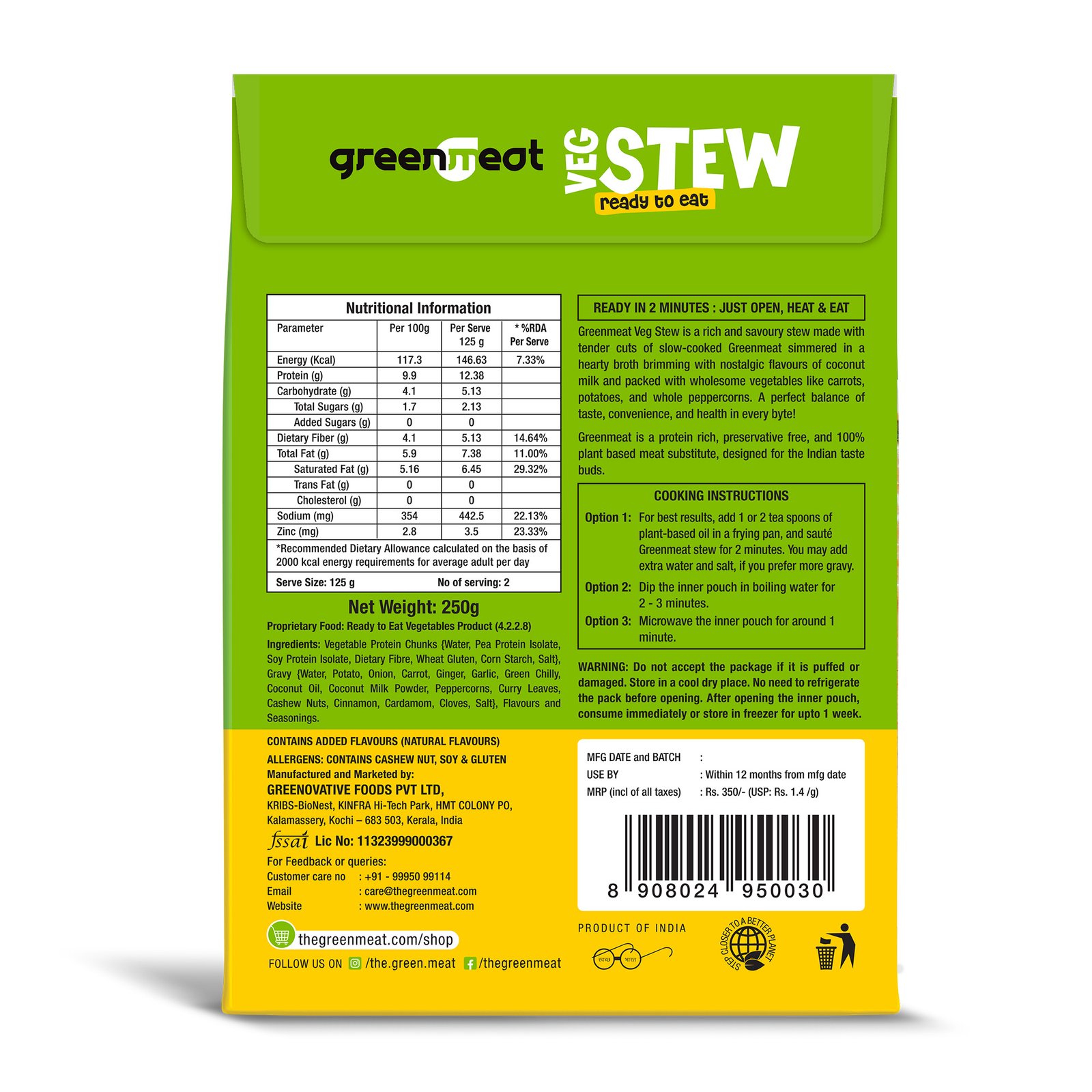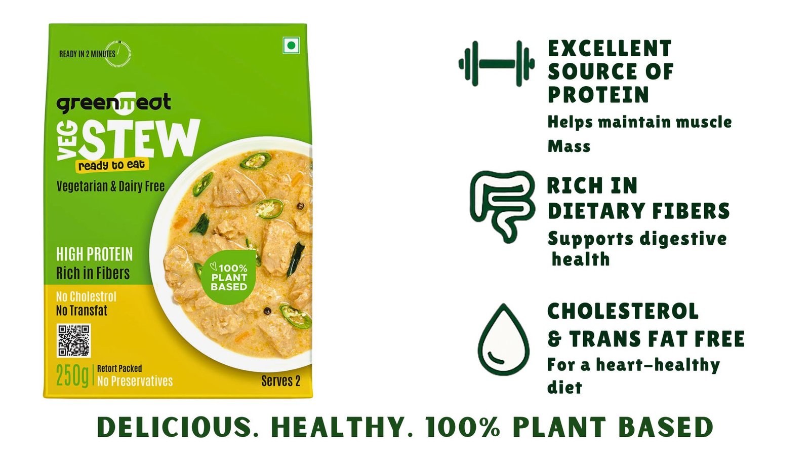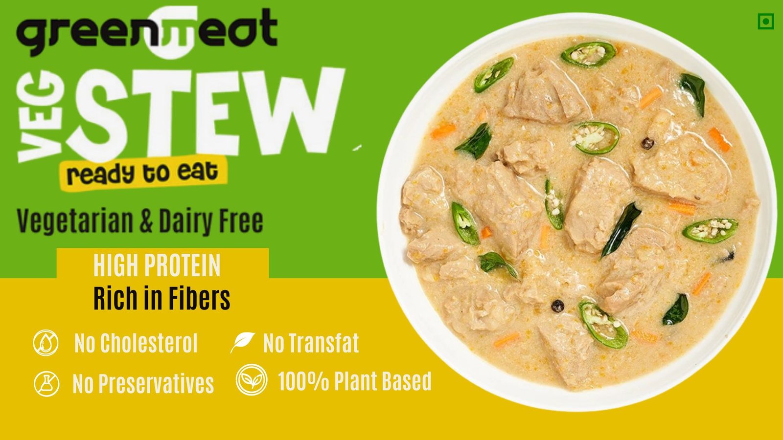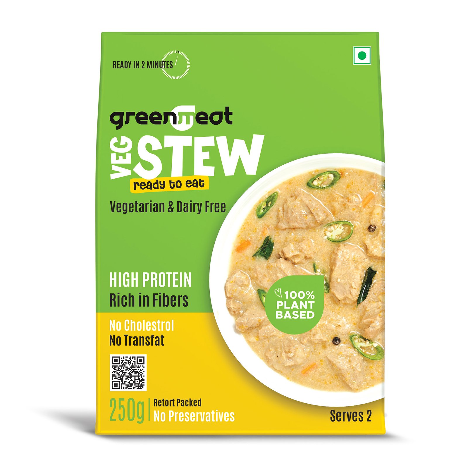 Discover the Greenmeat Veg Stew, a delectable and convenient ready-to-eat plant-based curry, perfect for a quick and nutritious meal. Each serving is packed with 12.4g of plant protein, complete with essential amino acids, and 5.1g of fiber, delivering the nutritional benefits of animal protein in a 100% vegetarian, dairy-free, and cholesterol-free format. Indulge in a guilt-free, healthy alternative without compromising on taste.